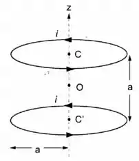 Duas bobinas circulares coaxiais idênticas, de espessura desprezível, com espiras de raio em cada bobina, transportam correntes de mesma intensidade e mesmo sentido, e estão colocados uma acima da outra, com seus centros e separados por uma distância (fig.) Considere o campo ao longo do eixo, na vizinhança do ponto médio do segmento , tomado como origem.