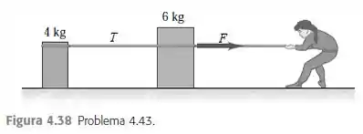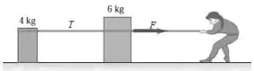 Duas caixas, uma de massa e outra de , estão em repouso sobre a superfície sem atrito de um lago congelado, ligadas por uma corda leve . Uma mulher usando um tênis de solado áspero (de modo que ela possa exercer tração sobre o fio) puxa horizontalmente a caixa de com uma força que produz uma aceleração de .