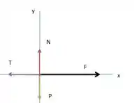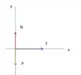 - A força normal: vertical para cima . Seu módulo nesse caso é igual ao peso, pois o sistema está em repouso em relação ao eixo vertical;