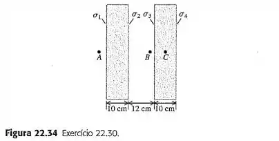 Duas placas de plástico muito grandes e não-condutoras, cada qual com espessura de , carregam densidades de carga uniforme e sobre suas superfícies, como indica a Figura . Essas densidades superficiais de carga possuem os valores , , e . Use a lei de Gauss para determinar o módulo, a direção e o sentido do campo elétrico nos seguintes pontos, afastados das bordas dessas placas: ponto , a da face esquerda da placa à esquerda; ponto , a da superfície interna da placa à direita; ponto , no meio da placa à direita.
