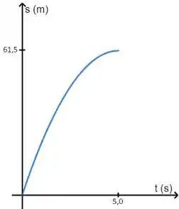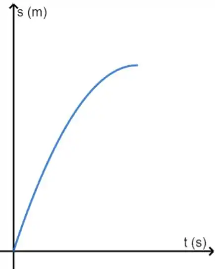 Perfeito! Percebe como isso não é nada mais do que uma equação do segundo grau? Esse gráfico nós conhecemos como uma parábola, como só nos interessamos no movimento até a parada completa do veículo, só precisamos esboçar metade dessa parábola. Além disso, repare que o t² acompanha um número negativo, o que já nos permite concluir que a parábola terá concavidade voltada para baixo. Ainda, se substituirmos ali, obteremos como resultado , isso significa que o gráfico parte da origem. Portanto, nosso primeiro esboço vai ficar assim: