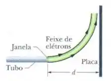 Um feixe de elétrons de energia cinética emerge de uma "janela" de folha de alumínio na extremidade de um acelerador. A uma distância da janela existe uma placa de metal perpendicular à direção do feixe (Fig. 28-57). (a) Mostre que é possível evitar que o feixe atinja a placa aplicando um campo uniforme tal que