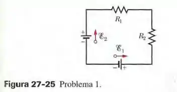 Na Fig. 27-25 , as fontes ideais têm forças eletromotrizes e e os resistores têm resistências e. Determine (a) a corrente no circuito; (b) a potência dissipada no resistor l; ( c) a potência dissipada no resistor 2; ( d) a potência fornecida pela fonte l ; (e) a potência fornecida pela fonte 2. (f) A fonte l está fornecendo ou recebendo energia? (g) A fonte 2 está fornecendo ou recebendo energia?