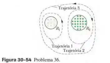 A Fig. 30-54 mostra duas regiões circulares, e , de raios e . Em existe um campo magnético uniforme de módulo dirigido para dentro do papel e em existe um campo magnético uniforme de módulo dirigido para fora do papel (ignore os efeitos de borda). Os dois campos estão diminuindo à taxa de . Calcule o valor (a) para a trajetória 1; (b) para a trajetória 2; (c) para a trajetória 3.