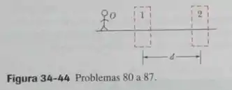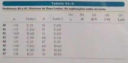 Na Fig 34-44, o boneco (o objeto) está sobre o eixo central comum de duas lentes delgadas simétricas, que estão nas regiões indicadas por retângulos tracejados. A lente 1 está na região mais próxima de , a uma distância do objeto. A lente 2 está na região mais afastada de , a uma distância da lente 1. Para cada problema, a Tabela 34-9 mostra uma combinação diferente de lentes e a diferentes valores das distancias, que são dadas em centímetros. O tipo de lente é indicado por para uma lente convergente e para uma lente divergente; o número que se segue a ou é a distância entre a lente e um dos pontos focais (o sinal apropriado para a distância focal não está indicado).