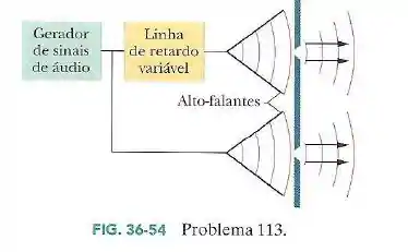 A Fig. 36-54 mostra um sistema acústico de dupla fenda no qual a distância entre as fendas é d e a largura das fendas é a. Usando uma linha de retardo variável é possível fazer variar a fase de um dos alto-falantes em relação ao outro. Descreva com detalhes o que acontece com a figura de difração de dupla fenda a grandes distâncias quando a diferença de fase entre os alto-falantes varia de zero a 2. Leve em conta tanto os efeitos de interferência como os de difração.