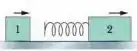 Na Fig. 9-63, o bloco 1 (com uma massa de ) está se movendo para a direita com uma velocidade escalar de e o bloco 2 (com uma massa de ) está se movendo para a direita com uma velocidade escalar de . A superfície não tem atrito e uma mola com uma constante elástica de está presa no bloco 2. Quando os blocos colidem, a compressão da mola é máxima no instante em que os blocos têm a mesma velocidade. Determine a máxima compressão da mola .