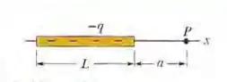Na Fig. 22-46, uma barra não condutora de comprimento tem uma carga uniformemente distribuída. (a) Qual é a densidade linear de cargas da barra? Determine (b) o módulo e (c) a direção (em relação ao semieixo positivo) do campo elétrico produzido no ponto , situado no eixo , a uma distância da extremidade da barra. Determine o módulo do campo elétrico produzido em um ponto situado no eixo , a uma distância do centro da barra, (d) pela barra e (e) por uma partícula de carga colocada no lugar anteriormente ocupado pelo centro da barra.