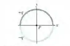 Nesse problema temos duas barras curvas de plástico, uma de carga e outra de carga , formam uma circunferência de raio no plano . O eixo passa pelos dois pontos de ligação entre os arcos e a carga está distribuída uniformemente nos dois arcos.