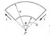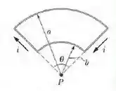 Nesse problema temos dois arcos de circunferência têm raios e , subtendem um ângulo , conduzem uma corrente de e têm o mesmo centro de curvatura P. A partir daí queremos determinar o módulo e o sentido (para dentro ou para fora do papel) do campo magnético no ponto P.