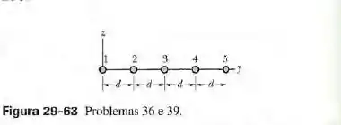 Na figura 29-63, cinco fios paralelos longos no plano estão separados por uma distância , têm de comprimento e conduzem correntes iguais de para fora do papel. Em termos dos vetores unitários, determine a força (a) sobre o fio 1. (b) sobre o fio 2; (c) sobre o fio 3; (d) sobre o fio 4; (e) sobre o fio 5.