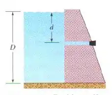 Na figura, a água doce atrás de uma represa tem uma profundidade . Um cano horizontal de de diâmetro atravessa a represa a uma profundidade . Uma tampa fecha a abertura do cano. (a) Determine o módulo da força de atrito entre a tampa e a parede do tubo. (b) A tampa é retirada. Qual é o volume de água que sai do cano em ?