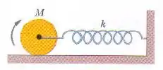 Na figura um cilindro maciço preso a uma mola horizontal () rola sem deslizar em uma superfície horizontal. Se o sistema é liberado a partir do repouso quando a mola está distendida de , determine (a) a energia cinética de translação e (b) a energia cinética de rotação do cilindro ao passar pela posição de equilíbrio. (c) Mostre que, nessas condições, o centro de massa do cilindro executa um movimento harmônico simples de período