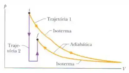A figura mostra duas trajetórias que podem ser seguidas por um gás de um ponto inicial até um ponto final . A trajetória consiste em uma expansão isotérmica (o módulo do trabalho é ), uma expansão adiabática (o módulo de trabalho é ), uma compressão isotérmica (o módulo do trabalho é ) e uma compressão adiabática (o módulo do trabalho é ). Qual é a variação da energia interna do gás se ele vai do ponto para o ponto seguindo a trajetória ?