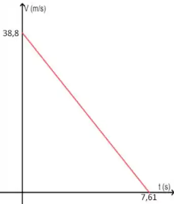 Essa é uma equação do primeiro grau, que conhecemos como uma reta, cujo coeficiente angular é negativo, ou seja, é uma reta decrescente. Dessa vez, se substituirmos , vamos obter o coeficiente linear 38,8, que corresponde à altura em que a reta corta o eixo y. O outro ponto importante é aquele em que a reta corta o eixo x, o que também corresponde ao momento em que a velocidade se torna 0. Olha como vai ficar o nosso gráfico: