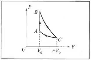 Numa máquina térmica, o agente é um gás ideal de coeficiente adiabático , que executa o ciclo da figura, onde é uma adiabática e uma isoterma. (a) Calcule o rendimento em função de e . (b) Exprima o resultado em função da razão entre as temperaturas externas. (c) Para e , qual é a razão entre o rendimento obtido e o rendimento de um ciclo de Carnot que opere entre e ?