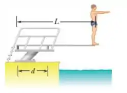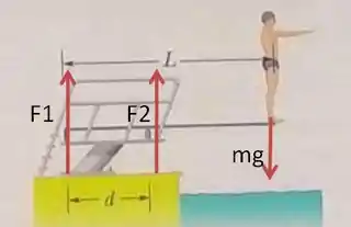 Um mergulhador com de peso está em pé na extremidade de um trampolim de comprimento e massa desprezível. O trampolim está preso em dois suportes separados por uma distância . Das forças que agem sobre o trampolim, qual é (a) o módulo e (b) o sentido (para cima ou para baixo) da força exercida pelo suporte de trás e (c) o módulo e (d) o sentido (para cima ou para baixo) da força exercida pelo suporte da frente? (e) Que pedestal (o de trás ou da frente) está sendo tracionado e (f)que pedestal está sendo comprimido?