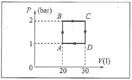 Um mol de um gás ieal diatômico () descreve o ciclo , onde é medido em e em . (a) Calcule a temperatura nos vértices. (b) Calcule a eficiência de um motor térmico operando segundo esse ciclo. (c) Compare o resultado (b) com a eficiência máxima ideal associada às temperaturas extremas do ciclo.