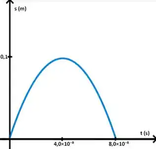 Um desses caras já conhecemos. Aquele ponto máximo é o que chamamos de ponto de inflexão, ele marca o momento em que a partícula, que se movia em um sentido, para e passa a se mover no sentido oposto, ou seja, naquele ponto, a velocidade é zero. No passo anterior, já encontramos que o espaço percorrido até que a velocidade se torne nula é 0,1 m, então é isso que vamos marcar ali no eixo y.