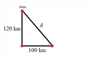 O navio deseja chegar no porto a ao norte de onde o navio parte, porém devido a tempestade ele se desloca para o leste. Para resolvermos a distância que ele precisa percorrer para chegar no porto, podemos aplicar o teorema de Pitágoras, pois podemos imaginar um triângulo retângulo ligando os pontos, como mostra a ilustração acima, então: