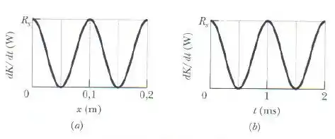 Uma onda senoidal é produzida em uma corda com uma massa específica linear de . Enquanto a onda se propaga, a energia cinética dos elementos de massa ao longo da corda varia. A figura mostra a taxa com a qual a energia cinética passa pelos elementos de massa da corda em um certo instante em função da distância ao longo da corda. A figura é semelhante, exceto pelo fato de que mostra a taxa com a qual a energia cinética passa por um determinado elemento de massa (situado em um certo ponto da corda) em função do tempo . Nos dois casos, a escala do eixo vertical é definida por . Qual é a amplitude da onda?