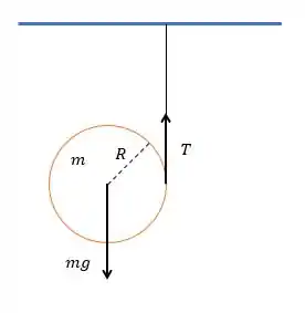 Prende-se ao teta a ponta de uma fita métrica leve, enrolada num estojo circular de massa e raio , e solta-se o estojo em repouso (Fig.). (a) Calcule a aceleração linear do estojo. (b) Calcule a tensão da fita. (c) Calcule a velocidade linear do estojo depois que um comprimento da fita se desenrolou. Verifique a conservação da energia.