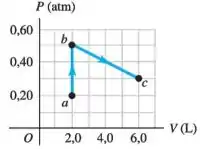 O processo abc mostrado no diagrama PV da Figura E19.11 envolve 0,0175 mol de um gás ideal. (a) Qual foi a temperatura mais baixa que o gás alcançou nesse processo? Onde ele ocorreu? (b) Quanto trabalho foi realizado pelo gás ou sobre o gás de a para b? E de b para e? (c) Se 215 J de calor fossem colocados no gás durante abc, quantos desses joules entraram na energia interna?