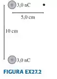 Quais são o módulo e a orientação do campo elétrico na posição indicada pelo ponto na FIGURA EX27.2? Especifique a direção por meio de um ângulo acima ou abaixo da horizontal.