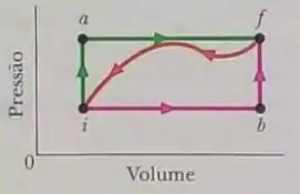 Quando um sistema é levado do estado i para o estado f ao longo da trajetória na figura, e . Ao longo da trajetória , . (a) Qual o valor de ao longo da trajetória ? (b) se para a trajetória de volta , qual será para essa trajetória? (c) Considere . Qual é ? (d) se , qual o valor de para a trajetória (e) e para a trajetória ?