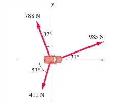 Para soltar uma caminhonete presa na lama, trabalhadores usam três cordas horizontais, produzindo os vetores de força mostrados na Figura . (a) Ache os componentes e de cada um dos três puxões. (b) Use os componentes para achar o módulo, a direção e o sentido do resultante dos três puxões.