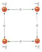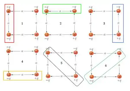 Na figura, temos 6 pares possíveis, 4 com distância e 2 com distância , que são os que estão opostos pelas diagonais do quadrado. Vamos combinar os pares de cargas possíveis e soma-los.