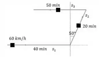 Um trem se move para o leste com uma velocidade constante de 60,0 km/h, durante 40,0 min, depois, na direção 50,0º nordeste, durante 20,0 min e, finalmente, na direção oeste, durante 50,0 min. Qual a velocidade média do trem durante esse percurso?
