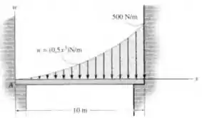 A ação do vento criou um depósito de areia sobre uma plataforma tal que a intensidade da carga de areia sobre essa plataforma pode ser aproximada por uma função . Reduza esse carregamento distribuído a uma força resultante equivalente e especifique a intensidade e a localização da força, medida a partir de .