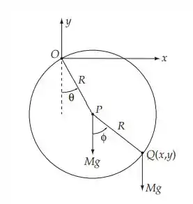 Seja O o ponto fixo no aro e a origem do sistema de coordenadas. P é o centro de massa do aro e Q(x,y) é a posição da massa M. As coordenadas de Q são: