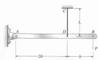 Uma barra rígida , presa por um pino na extremidade , é sustentada por um fio e carregada por uma força na extremidade (veja a figura). O fio é feito de aço de alta resistência tendo módulo de elasticidade e tensão de escoamento . O comprimento do fio é e seu diâmetro é . O diagrama de tensão-deformação para o aço está definido pela lei da potência modificada, da seguinte maneira: