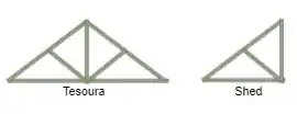 Treliças em tesouras são estruturas triangulares biapoiadas, geralmente são mais resistentes que as treliças em shed. Já as estruturas shed são como se fossem uma folha da tesoura, devendo ser reforçada para maior resistência já que nesta estrutura a parte mais alta fica em uma das extremidades da estrutura, como apresentado abaixo.