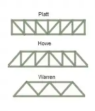As treliças do tipo Howe são compostas por barras diagonais comprimidas e montantes tracionados, já nas treliças do tipo Platt também são composta por barras diagonais porém tracionadas e com montantes comprimidos. A treliça Warren são compostas por barras diagonais com sem montantes tracionados ou comprimidos, sendo representadas pelas figuras abaixo.