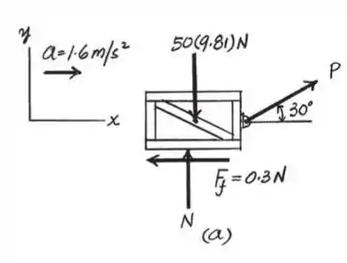 Se o caixote de 50 kg parte do repouso e atinge uma velocidade de v = 4m/s quando percorre uma distância de 5m para a direita, determine o módulo da força P que atua no caixote. O coeficiente de atrito cinético entre a caixa e o solo é μk=0,3.
