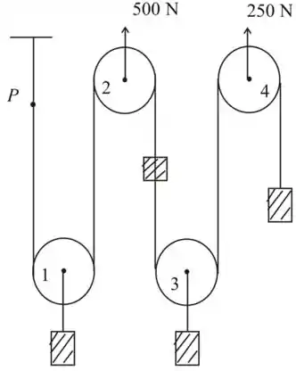 As polias são menos pesadas, portanto, não causa nenhuma alteração nas tensões em um determinado cabo através dele rola sobre a polia. Portanto, as tensões em ambos os lados do cabo são as mesmas