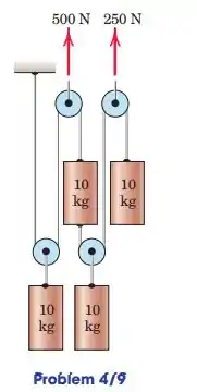 Calcule a aceleração do centro de massa do sistema dos quatro cilindros de 10 kg. Despreze o atrito e a massa das polias e cabos.