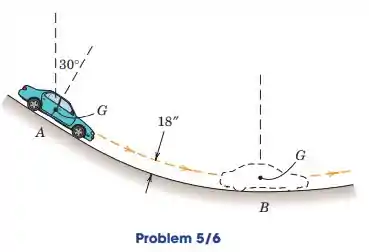 O centro de massa G do carro tem uma velocidade de 40 mi/h na posição A e 1,52 segundos depois em B tem um velocidade de 50 mi/h. O raio de curvatura do estrada em B é 180 ft. Calcule a velocidade angular de o carro em B e a velocidade angular média de o carro entre A e B.