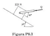 Os coeficientes de atrito entre o bloco de 225 N e o plano inclinado são . Verifique se o bloco está em equilíbrio e calcule o módulo e a direção da força de atrito com .
