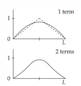 A figura abaixo mostra o primeiro termo, os dois primeiros termos e os três primeiros termos desta função. É evidente que a forma triangular está bem representada pelos três primeiros termos.