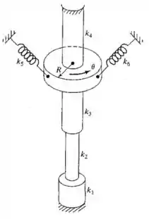Determine a constante elástica torcional equivalente do sistema mostrado na Figura 1.61. Admita que k 1 , k 2 , k 3 e k 4 são constantes torcionais e que k 5 e k 6 são constantes elásticas lineares.