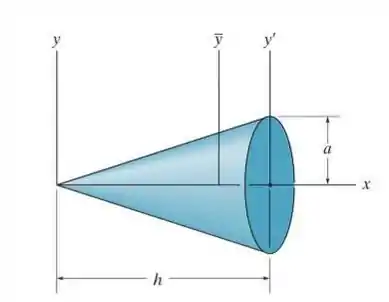 Determine o momento de inércia do cone em relação a um eixo vertical que passa pelo centro de massa do cone. Qual é o momento de inércia em relação a um eixo paralelo y' que passa pelo diâmetro da base do cone? O cone tem massa m.