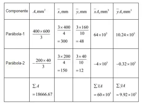 Os primeiros momentos das áreas componentes em relação aos eixos de coordenadas serão calculados e inseridos na tabela, como mostra a seguir: