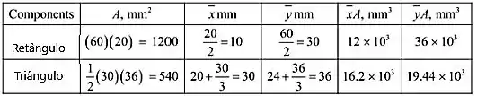 Usando os eixos de coordenadas, a área e as coordenadas do centroide de cada uma das áreas componentes são determinadas
