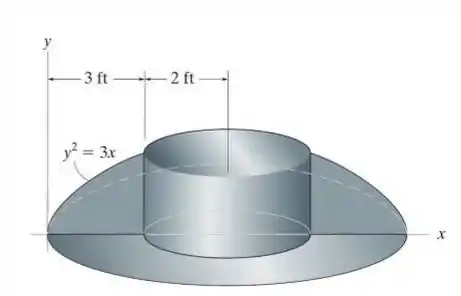 Determine o produto da inércia do objeto formado girando a área sombreada em torno da linha x = 5 pés. Expresse o resultado em termos da densidade do material, ρ.