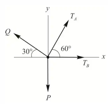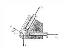 Duas forças P e Q de intensidade e são aplicadas a uma conexão de avião. Sabendo que a conexão está em equilíbrio, determine a tração nas barras A e B.
