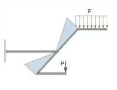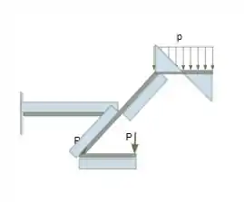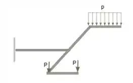 Analisando agora para esboçarmos o diagrama de força cortante, analisaremos pelas barras separadamente, a barra com peso distribuído temos uma força cortante que se encontra no meio da barra, onde acontece a distribuição do peso nos cálculos. Na barra da outra extremidade temos pesos pontuais atribuídos nas extremidades sendo assim teremos a força cortante constante novamente. Já na barra que interliga esta temos o mesmo caso da última barra analisada. Já na barra fixada teremos uma força cortante fixa em toda a extensão da barra.